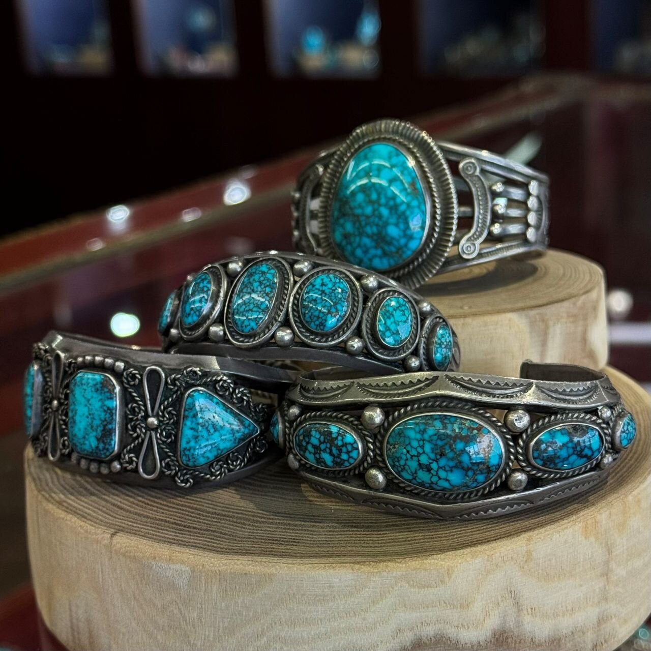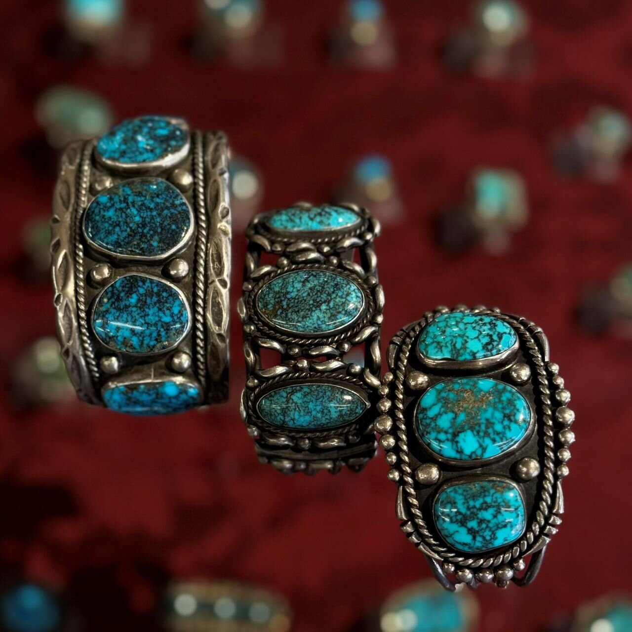 今回のメインヴィジュアルは私の憧れるナバホ族のアーティスト、「フレッド・ペシュラカイ(FRED PESHLAKAI=F.P.)」氏のバングルです。インディアンジュエリーの歴史に名を遺す大作家であり、彼によってインディアンジュエリーが一段上のステージに上がったと言われるほど後世の作家に影響を与えた人物です。4本のバングルはどれも素晴らしいですが、特に右下のブックピース(F.P.写真集掲載)は、実物を見て感動されるお客様が多いです。手前の2本は共にホールマーク(作家が特定できるサインや刻印)入り、奥の2本はホールマークはないですが、スタンプの入り方や種類、作品のオーラから「F.P.」で間違いないと思います。どれも素晴らしいターコイズとのセットで、文字通り一生物のバングルです。