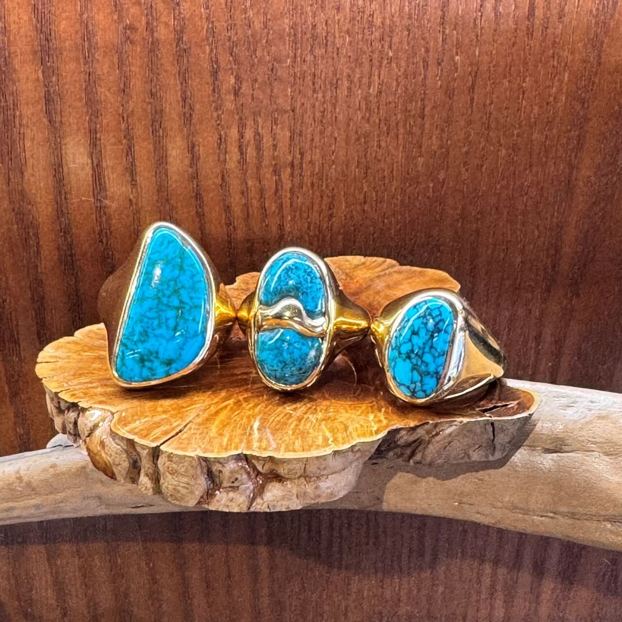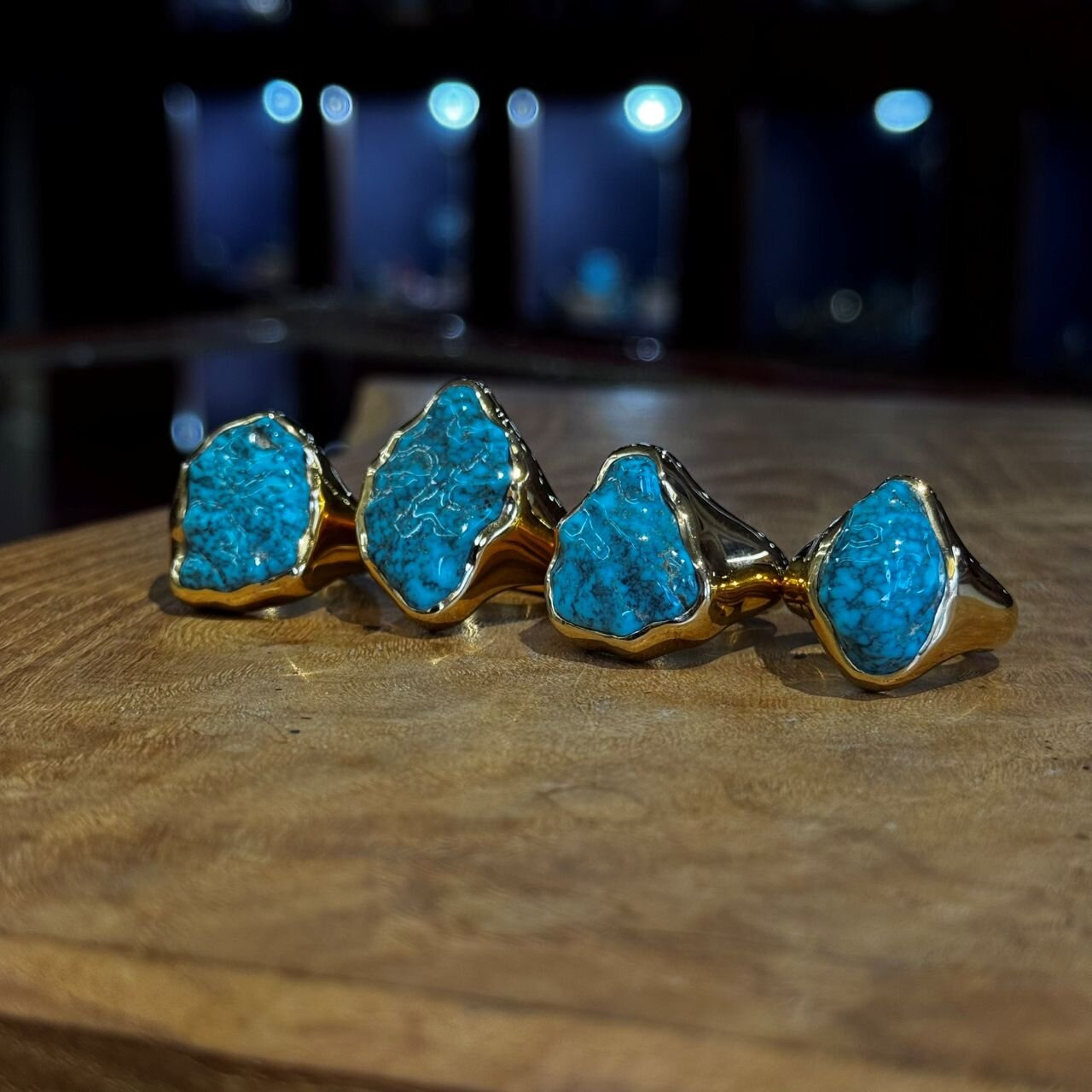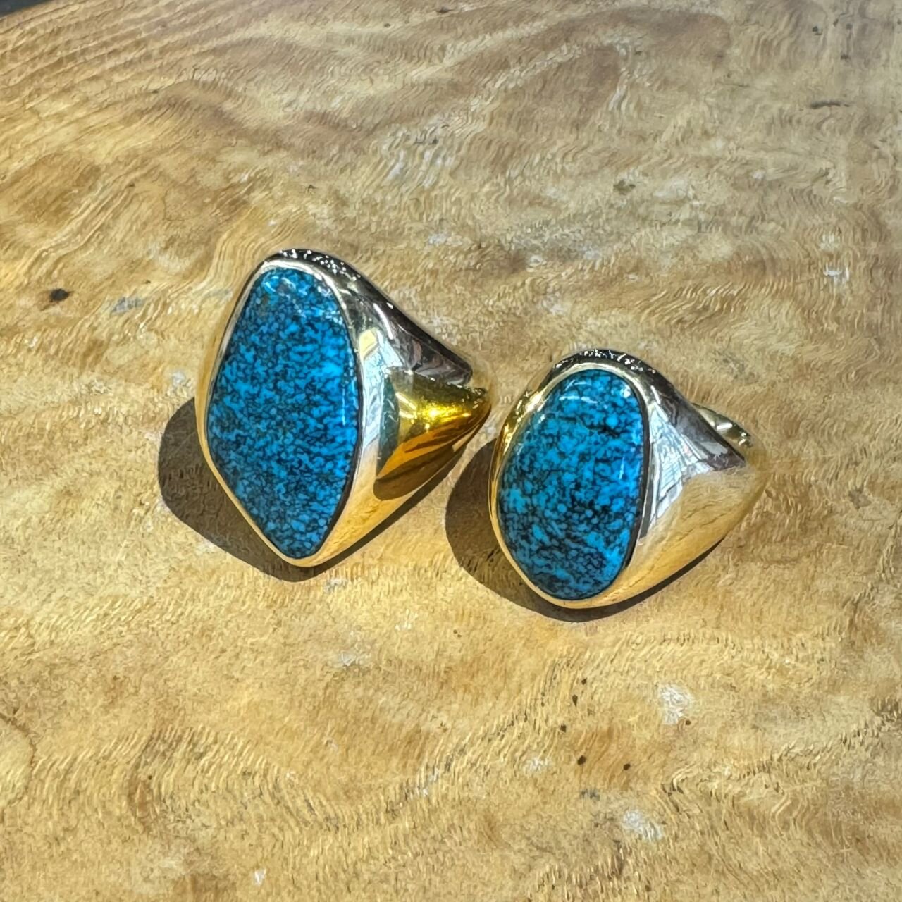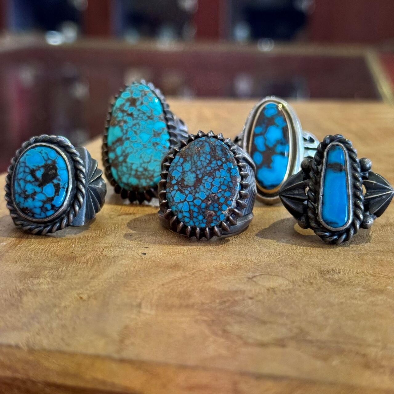 <ヤストモ コデラ>のネバダ州産キャンデラリアターコイズ2点、ニューメキシコ州産タイロンターコイズ、ネバダ州産ガドバーターコイズ、アリゾナ産ビズビーターコイズ。どれがどのターコイズか、ターコイズ好きな方ならおわかりかもしれません。大きさも艶も申し分ないリング達ですが、実物はさらに輝いています。この細長いビズビーのリング、形も面白いしプライスも良いし、もうずっと欲しいです。ガドバー=バーナムでほとんど同じ鉱脈なのですが、採掘された年代・鉱山主の違いと、ガドバーの方がより発色があり乳白色がかった優しい青をしています。いずれも「良い」ターコイズに見られる特徴です。