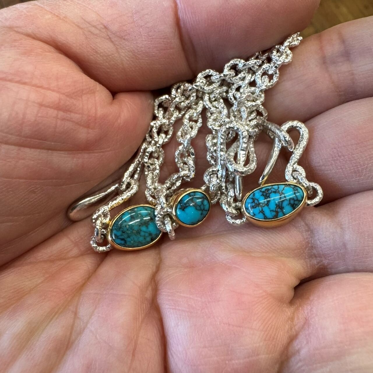 小粒で美しいローンマウンテンターコイズがセットされたハンドメイドの<スカイ ブルー ホーク>のチェーンネックレスとバングルのキャッチ部分。ターコイズの周りを囲うベゼルはK20YGを使用してアクセントにしています。シルバーも小寺さんが生み出してブリタニアシルバーと名付けた、純度を95.8%に上げた素材を使用。92.5%のスターリングシルバーより更に白く輝き、ハンドメイドのぬくもりと、ハンマーワークによる凹凸で肌との接着面積を小さくすることで肌馴染みもよくさらっと着けられて、ベタっとなりません。着け心地が良くてずっと身に着けていたくなります。