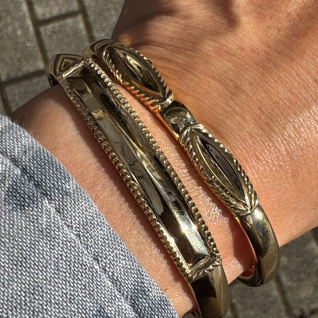 <ヤストモ コデラ>のローンマウンテンがセットされた20KYGのバングルと、18KYGバングルのスタッキングサンプル。重ねる順番で見え方が変わるバングルは、コーディネートの奥深さを存分に楽しめます。美しいローンマウンテンの表情が揃って5つセットされたバングルのように統一感あるバングルを今後何本作れるのだろうか、と小寺さんが嘆くほど絶滅危惧な1本です。ゴールドの高騰と相まって高級時計のプライスになっていますが、ずっと楽しんでいただけるのでぜひ実物をご覧いただきたいです。
