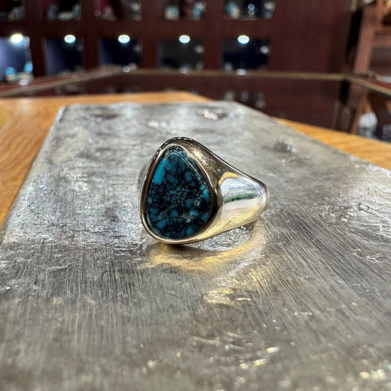 ここからはいよいよ小寺さんが生み出す1点物のご紹介です。全て<ヤストモ コデラ>のローンマウンテンターコイズのリング。ターコイズの王様、ローンマウンテンターコイズは多彩な表情の中にその鉱脈らしさがしっかりと見えるのが、コレクター心を捉える理由だと思います。そしてきれいで硬いのが何より素晴らしいです。小寺さん作のシルバーリング自体が年々少なくて珍しくなり、中でも月に4個作ったら身体中が悲鳴をあげるというファイルワーク(ヤスリ掛け)を駆使したシグネチャーの爪のようなベゼル、通称「ヤスベゼル」はセットしたターコイズを美しく引き立たせます。