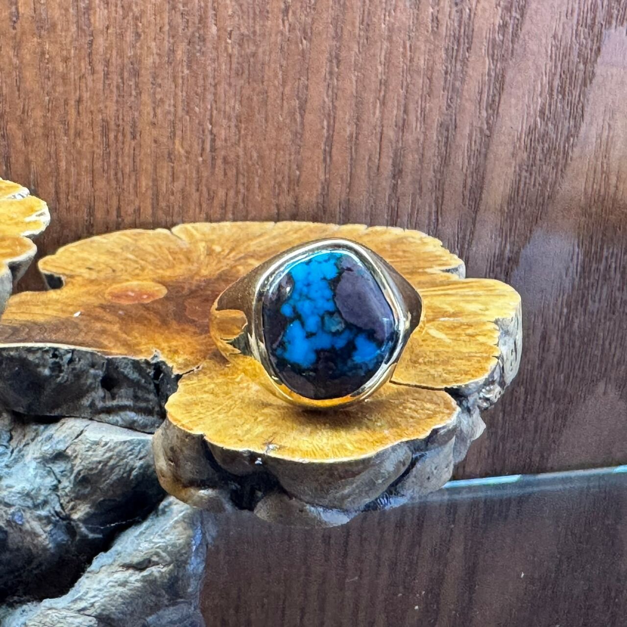 <ヤストモ コデラ>のナゲット(塊状)のローンマウンテンターコイズを贅沢にセットした20KYGリング、通称アイランドリング。小寺さんの代名詞がこのデザインのリングです。通常はスライスしてバッキング(底材)をつけて、2つ、3つにして販売するような厚みのある塊をそのまま磨きあげて良い部分を残したターコイズで、表面には自然の凹凸が残っています。小寺さん以外にこのグレードを扱える人はそういないはずのまさに幻のターコイズ。ターコイズ好きが行き着くアンドロメダ=終着駅だと思います。私もシルバー製のアイランドリングを持っていますが、一生身に着けると決めています。