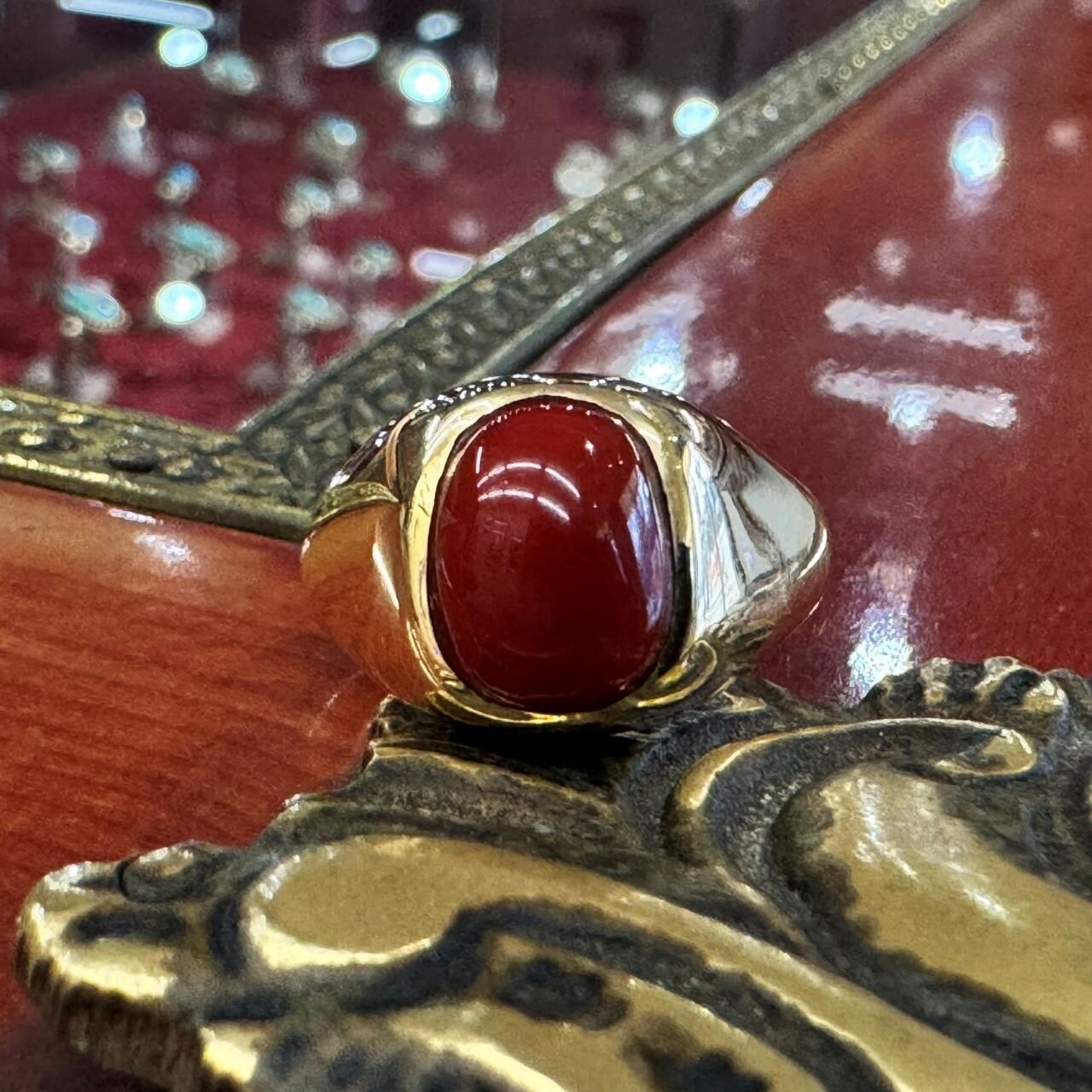 <ヤストモ コデラ>の日本産赤珊瑚をセットした18KYGリング。血赤珊瑚と呼んでよいほど赤い珊瑚です。滑らかな見た目は男性だけでなく女性にもおすすめしたいリングです。とにかく小寺さんの赤珊瑚は、セオリー無視で大きくカットしてカッコよくセットしているので、話題になるリングです。