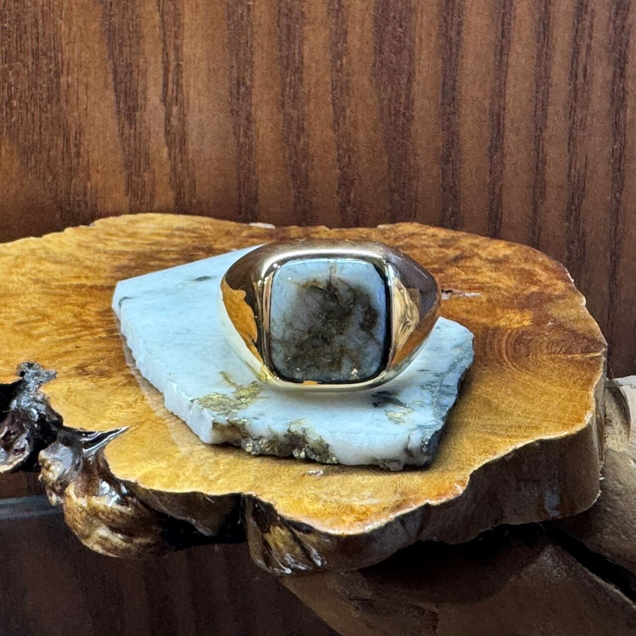 こちらも<ヤストモ コデラ>のローンマウンテンターコイズをセットした20KYGリング。このような美しいタイトウェブ(細かい模様)のローンマウンテンは本当に美しいです。ターコイズの成り立ちや採掘された環境。どこで採れたかで模様や成分が異なるため、同じ模様のターコイズがないのです。自分だけのターコイズが持てるのは大きな喜びではないでしょうか。