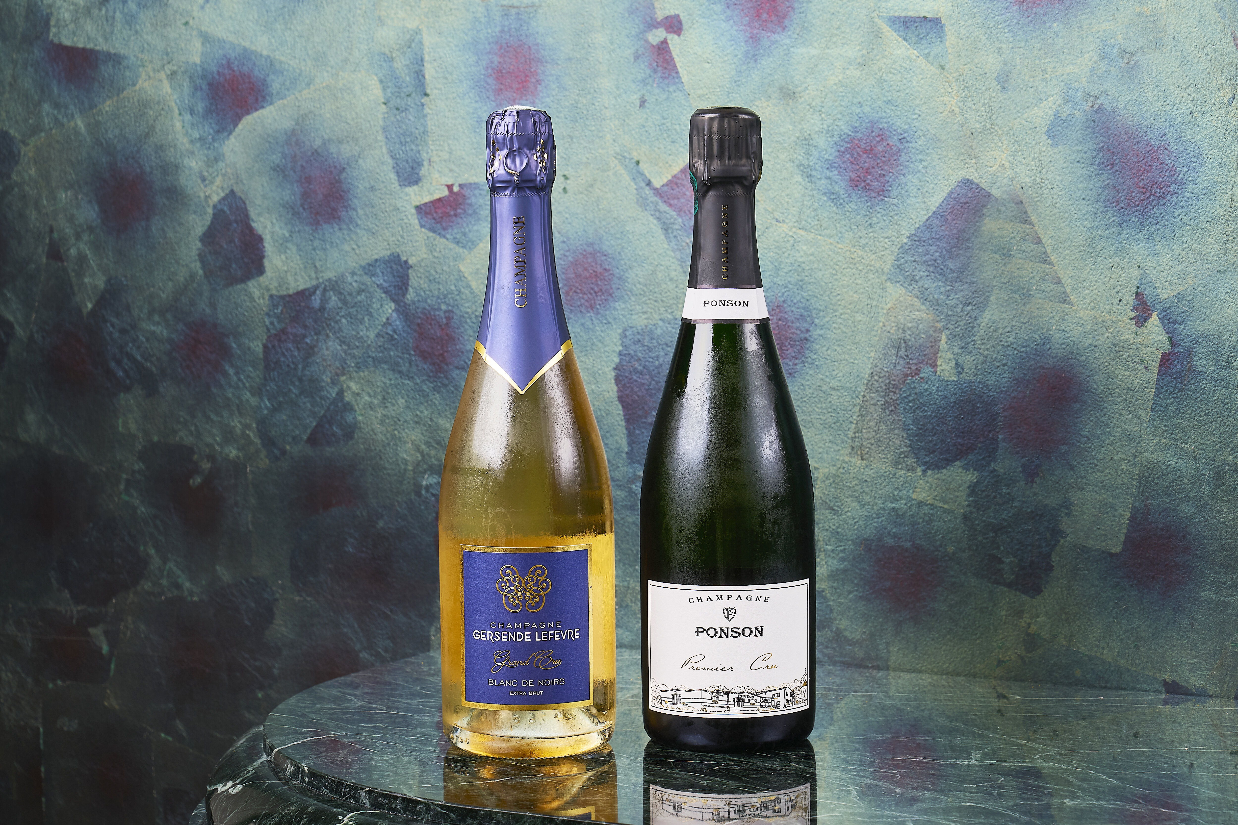(右)ポンソン プルミエクリュ エクストラブリュット(グラス)¥1,900(税込)・(左)ジェルサンド ルフェール ブランドノワール(グラス)¥2,300(税込)