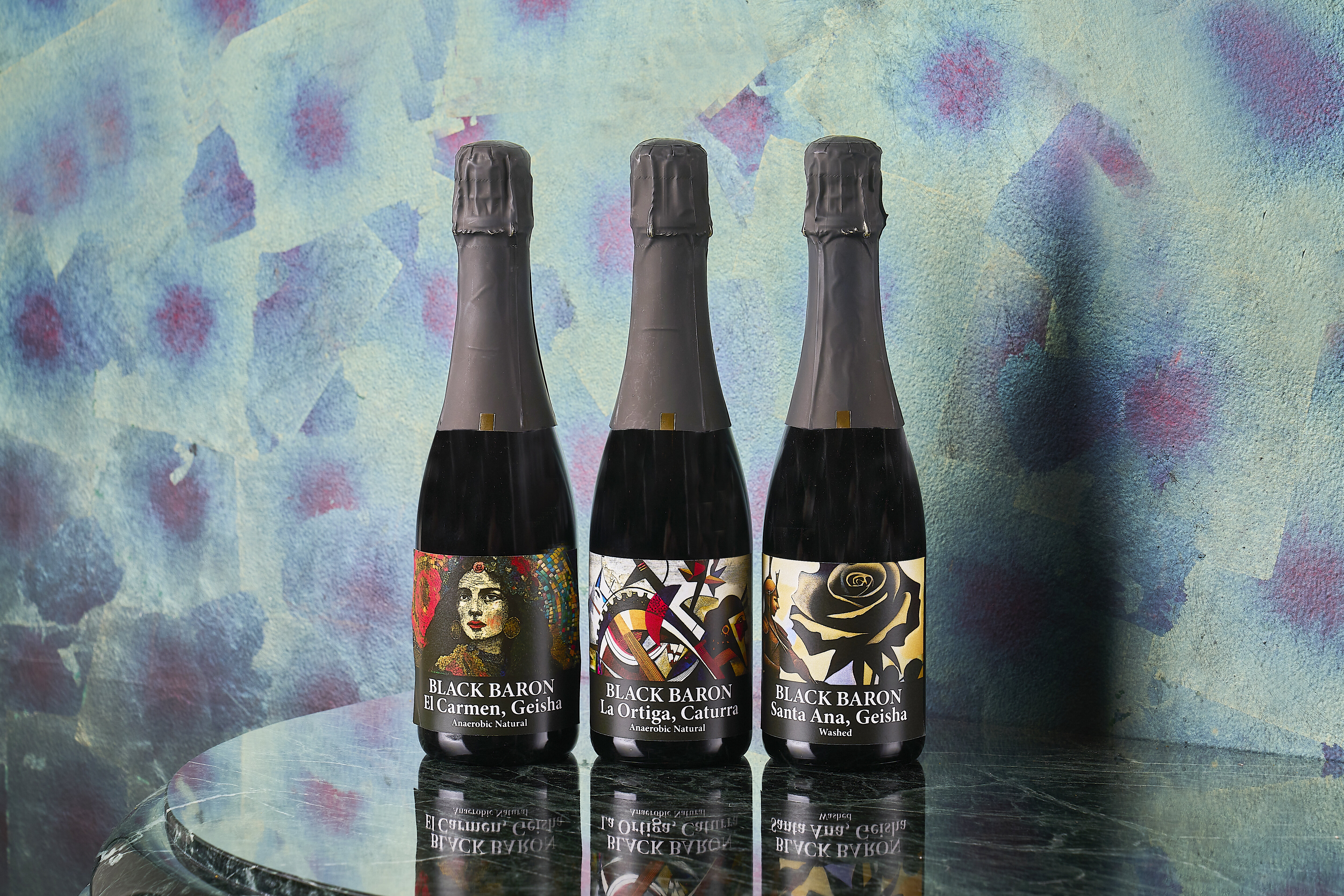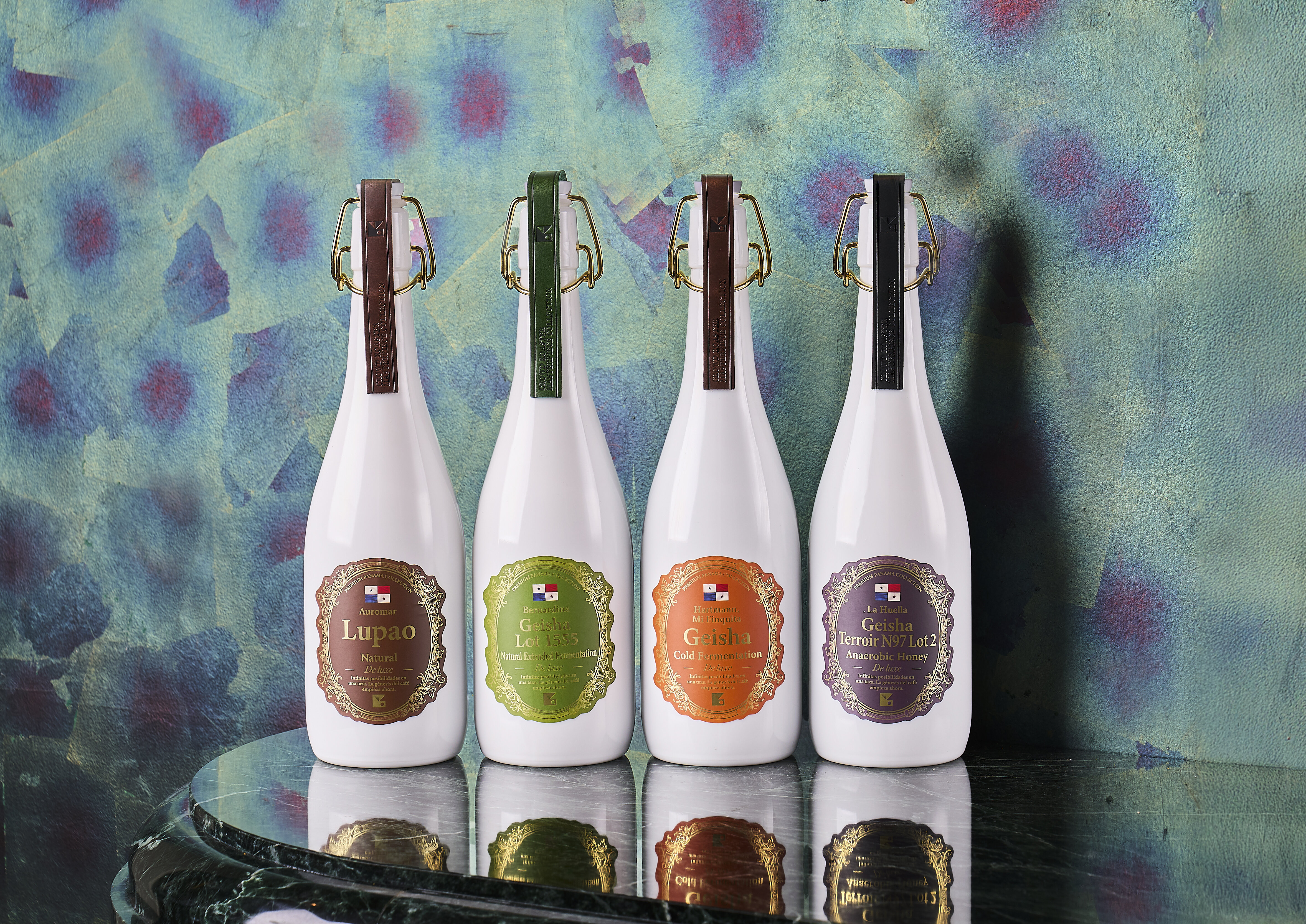 (左から)アウロマール ルパオ ナチュラル(1ボトル200g)¥22,000(税込)・ベルナルディナ ゲイシャ ナチュラル エクステンデッド ファーメンテーション(1ボトル200g)¥33,000(税込)・ハートマン ミ フィンキータ ゲイシャ コールド ファーメンテーション(1ボトル200g)¥66,000(税込)・ラ ウエリア ゲイシャ ハニー テロワール N97 アナエロビック スペシャルエディション Lot 2(1ボトル200g)¥88,000(税込)