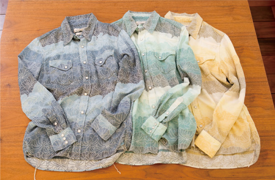 以前に行ったハワイでサーフィンの資料室に入れてもらったときに、そこに資料として置いてあったカーテンやラグがこのシャツのモチーフなんです。これはインディゴを6色に染め上げています。インディゴの染め方にはさまざまな手法があるんですが、シャツなのでデニムのように色落ちしないよう「チーズ染め」を用いています。グリーンとイエローのほうは「硫化染め」でこれもまた違う染め方ですが、風合いがあります。1960年代の米国ではよく行われていた染め方ですが、今の日本ではほとんど見ることのない染め方です。またインディゴにジャカード織りを入れるというのは難しいので嫌がられるのですが、それをあえてやりました(笑)。織り柄にインディゴを6色で染めてグラデーションを作っているので、これを何年か着込んでいくとまた違った表情になるのを楽しんでもらえればと思います。