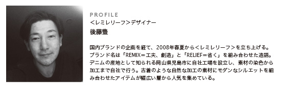 他にはないこだわりの加工が活きたデニムシャツやカットソー、ボトムスなど幅広いラインナップと、モダンなシルエットで店頭はもちろん、バーニーズ ニューヨークのスタッフからの人気も高い<レミレリーフ>。デザイナー後藤豊さん自らが望むものづくりのために自社工場を立ち上げ、素材や染料だけでなく加工をほどこす機器までも別注するというこだわりから生まれた美しい加工で着実にファンを増やしています。今回はデザイナー後藤豊さんに<レミレリーフ>が提案している世界観とこだわりの素材加工について聞きました。