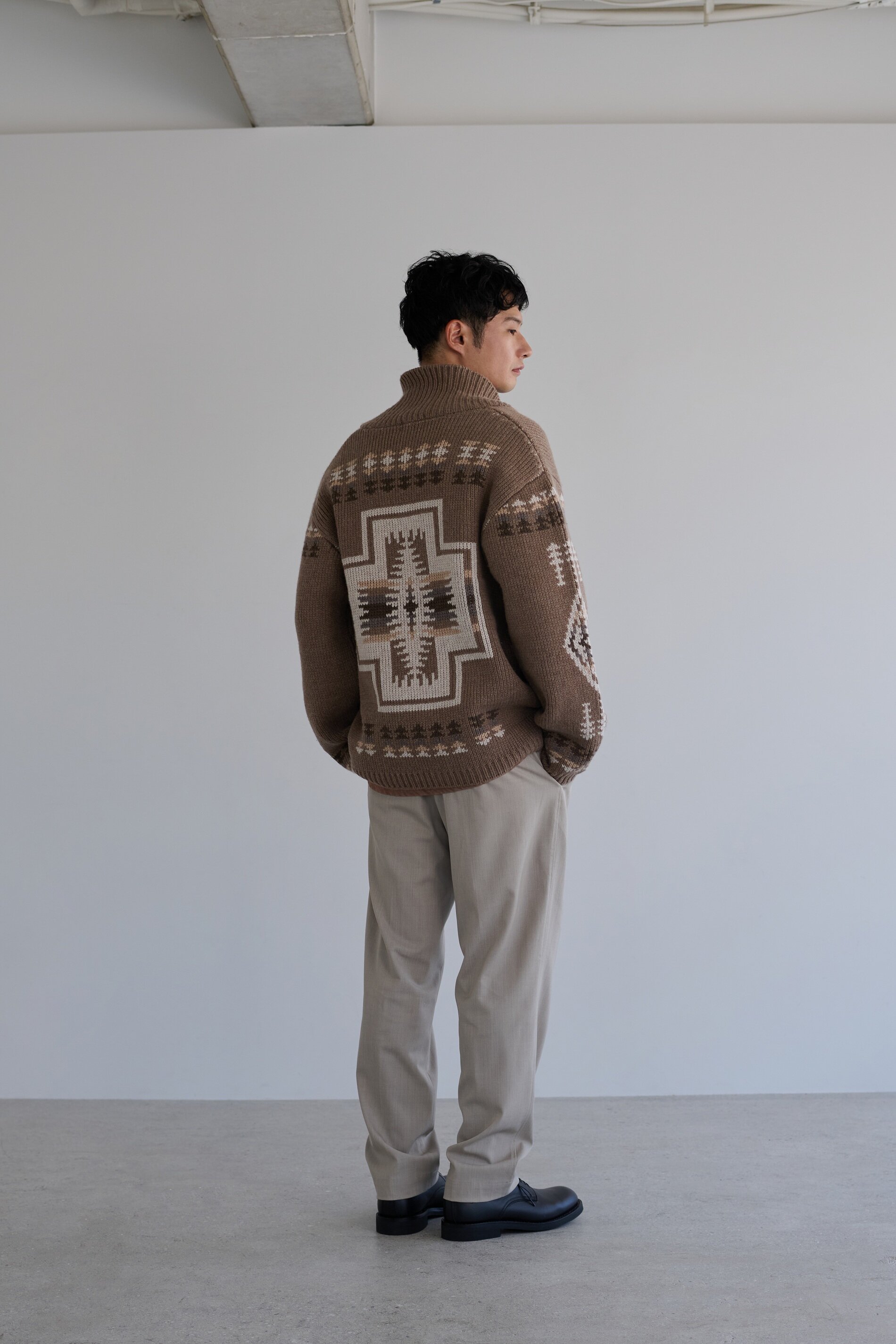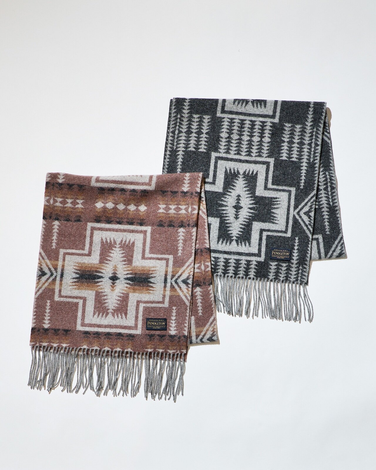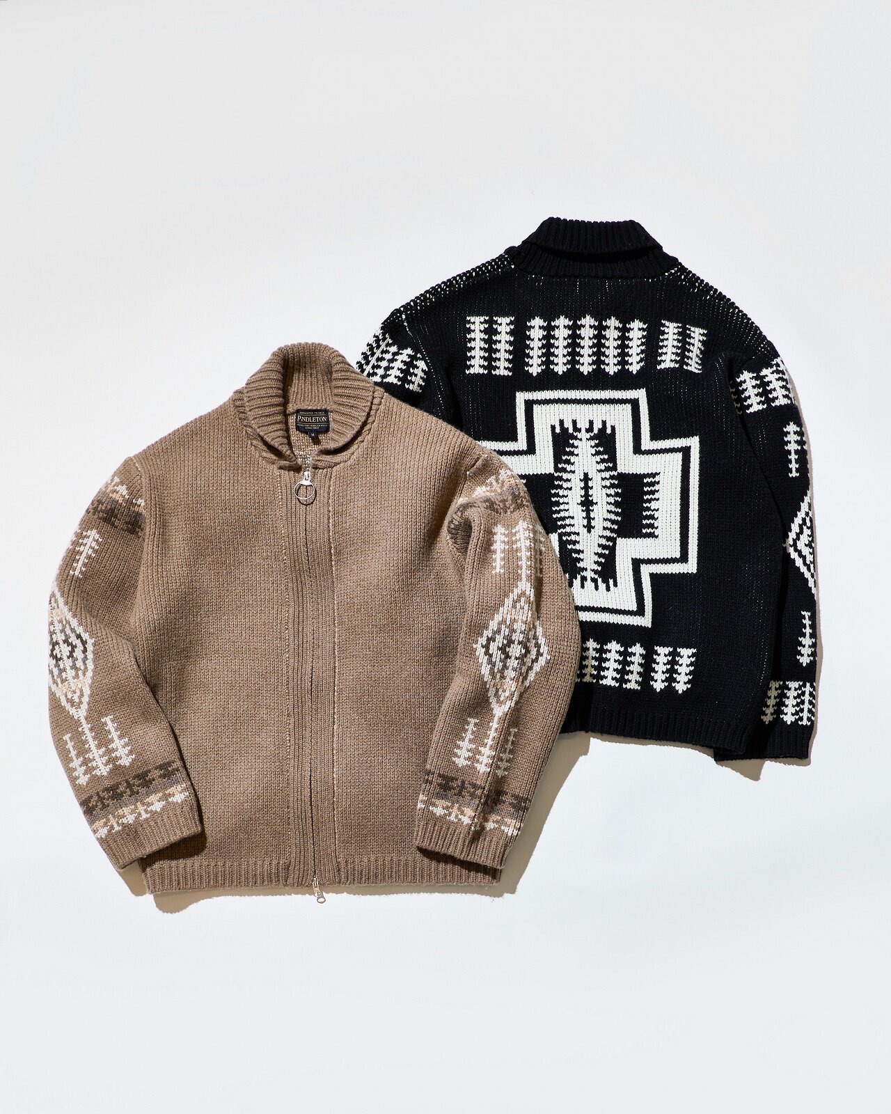 それぞれにネイティブアメリカンの伝統的なモチーフであるハーディング柄を落とし込んだデザインが特長で、バーニーズ ニューヨーク別注の素材を採用し、レザー仕様のロゴネームを施したラグジュアリーなアイテムです。肉厚なジップアップカーディガンは、化繊ではなくカシミヤをブレンドすることで柔らかい風合いに。スカーフはカシミヤ100%の肌馴染みの良い質感で、<ペンドルトン>からも恐らく初めての素材別注だというほど、バーニーズ ニューヨークテイスト溢れるアイテムです。