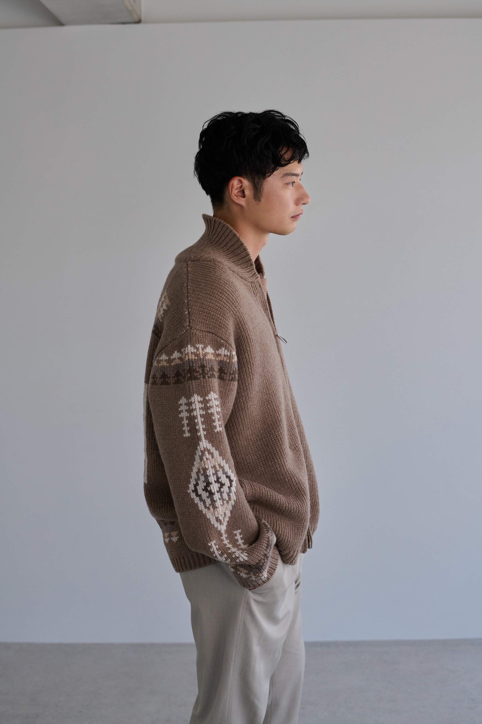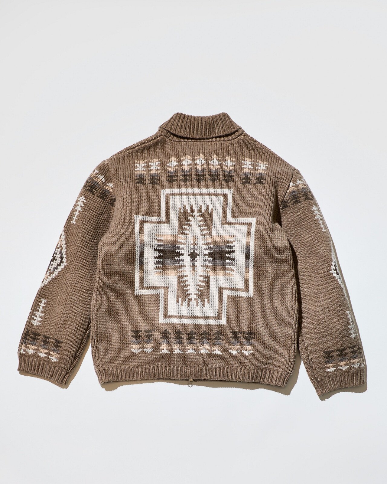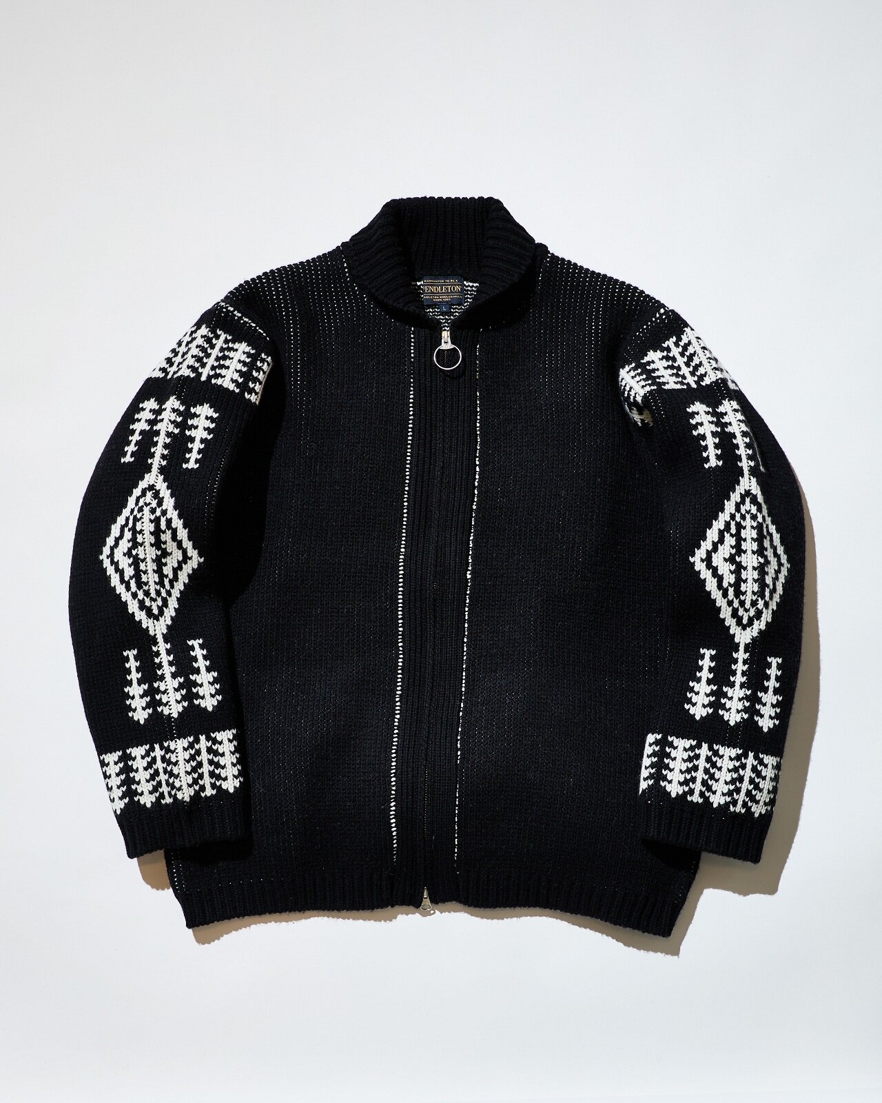 それぞれにネイティブアメリカンの伝統的なモチーフであるハーディング柄を落とし込んだデザインが特長で、バーニーズ ニューヨーク別注の素材を採用し、レザー仕様のロゴネームを施したラグジュアリーなアイテムです。肉厚なジップアップカーディガンは、化繊ではなくカシミヤをブレンドすることで柔らかい風合いに。スカーフはカシミヤ100%の肌馴染みの良い質感で、<ペンドルトン>からも恐らく初めての素材別注だというほど、バーニーズ ニューヨークテイスト溢れるアイテムです。