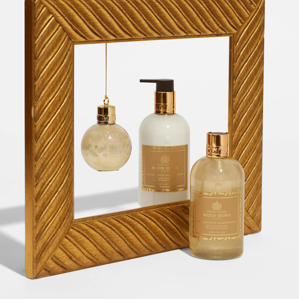 ラグジュアリーなバスタイムを演出する英国発<モルトンブラウン>の"フェスティブヴィンテージエルダーフラワー コレクション"。ツリーに飾るオーナメントのようなボール型や300mLボトルタイプのバス&シャワージェル、ボディローションは、贈れば気持ちが伝わる逸品です。